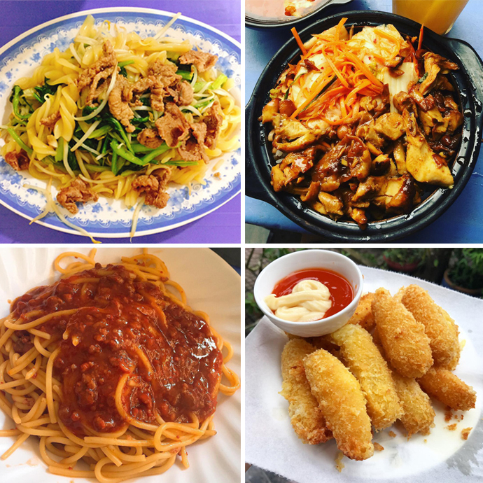 Đủ món ăn vặt: nui xào, spaghetti, nem chua rán, phô mai que và các món đường phố Hàn Quốc...