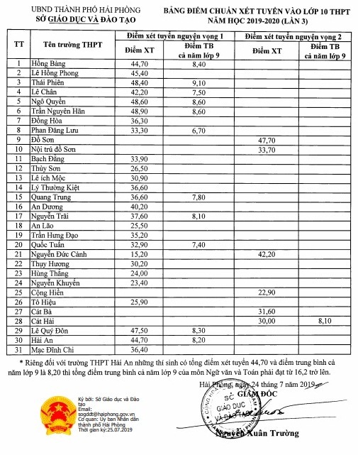 Đây là lần thứ 2 điểm chuẩn vào lớp 10 THPT công lập Hải Phòng năm học 2019-2020 được điều chỉnh và là lần thứ 3 được công bố. Trước đó, ngày 17/7, Hải Phòng đã có thông báo hạ điểm chuẩn lần 1.
